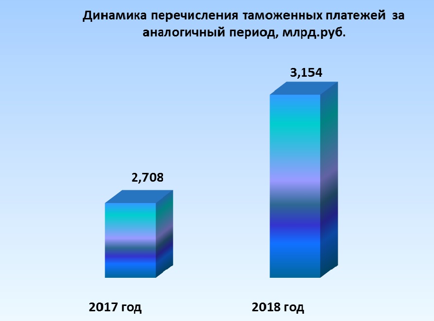 За 2018 год таможнями региона в доход федерального бюджета перечислено свыше 125 млрд. рублей (125 279, 29 млн. руб.). Плановое задание выполнено на 100%.