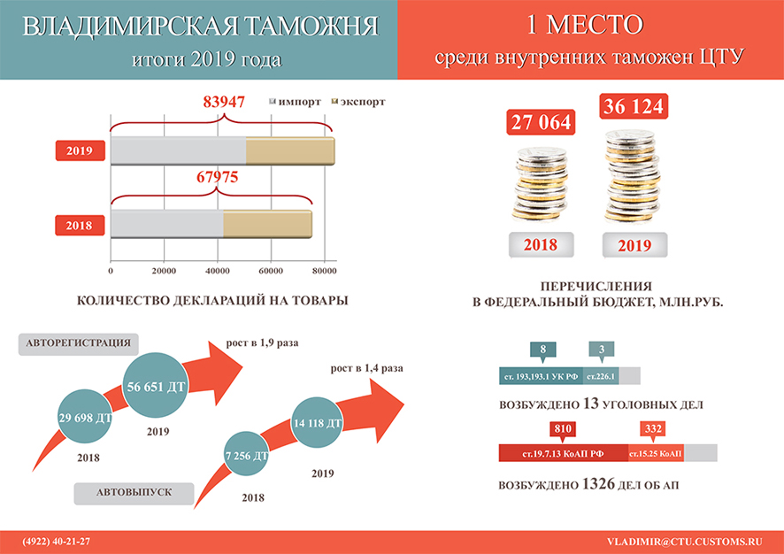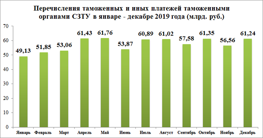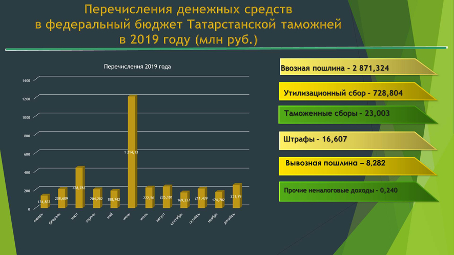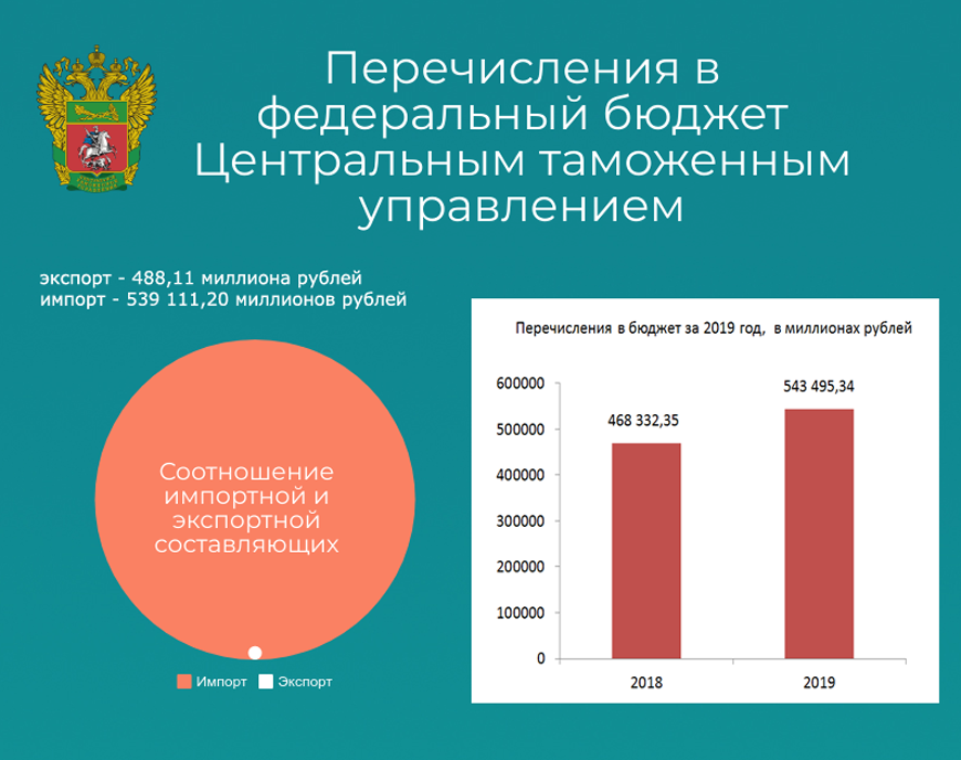 В 2019 году Центральным таможенным управлением перечислено в федеральный бюджет 543 495,34 миллиона рублей. Импортная составляющая - 539 111,20 миллионов рублей, а экспортная составляющая 488,11 миллиона рублей.