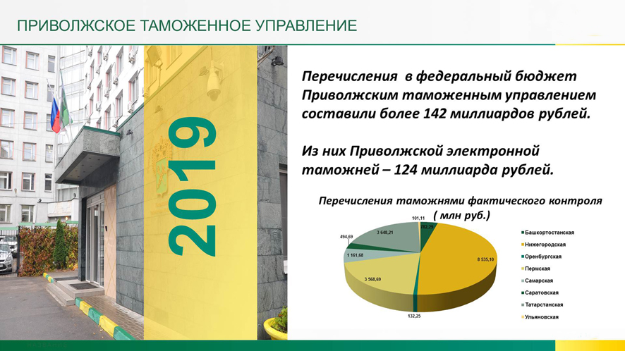За 2019 год таможнями Приволжского региона в доход федерального бюджета перечислено свыше 142 млрд рублей (142 598, 55 млн руб.). Плановое задание выполнено на 102%.