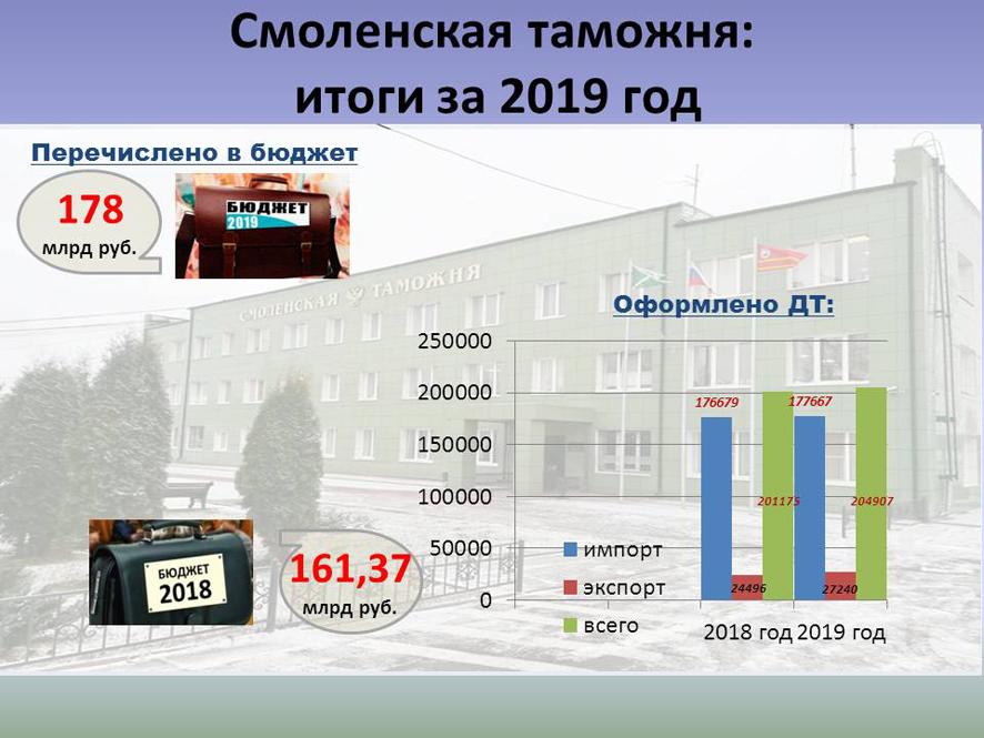 Таможенными постами Смоленской таможни за 2019 год оформлено 205,1 тыс. деклараций на товары (ДТ). Их число по сравнению с аналогичным периодом прошлого года выросло на 1,8%, в т.ч. количество экспортных деклараций - с 12,2% до 13,3%.