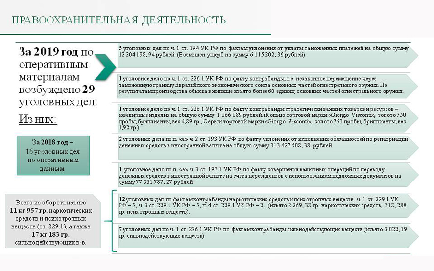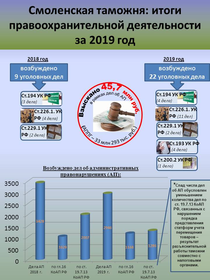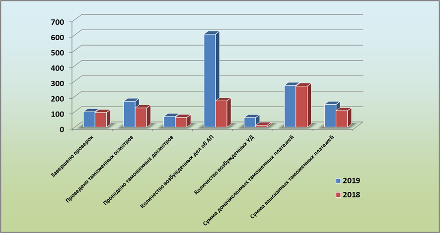 В 2019 году должностными лицами таможни возбуждено 3 355 дел об административных правонарушениях и 25 уголовных дел.