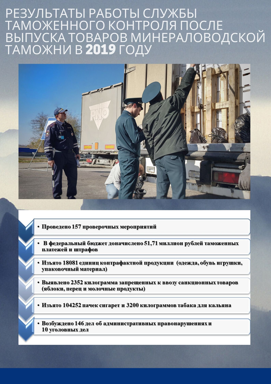 Работа подразделений таможенного контроля после выпуска товаров Самарской таможни строилась во взаимодействии с иными правоохранительными и контролирующими органами. Всего в 2019 году было проведено 11 совместных мероприятий.