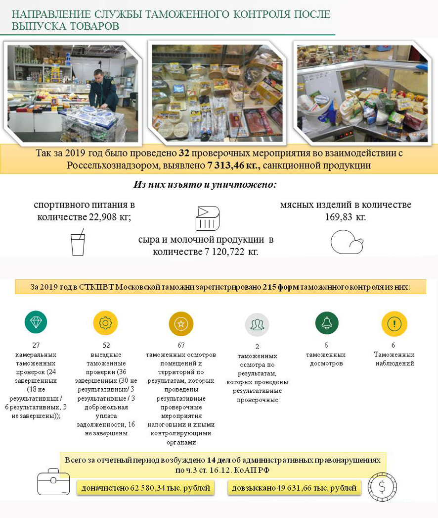 За прошедший год проверено более 192 000 тонн товаров, что на 60% больше значения 2018 года, более чем в 2 раза выросло количество выявленных нарушений законодательства (2 185 случаев), выявлено 640 407 единиц товаров, обладающих признаками контрафактной продукции.