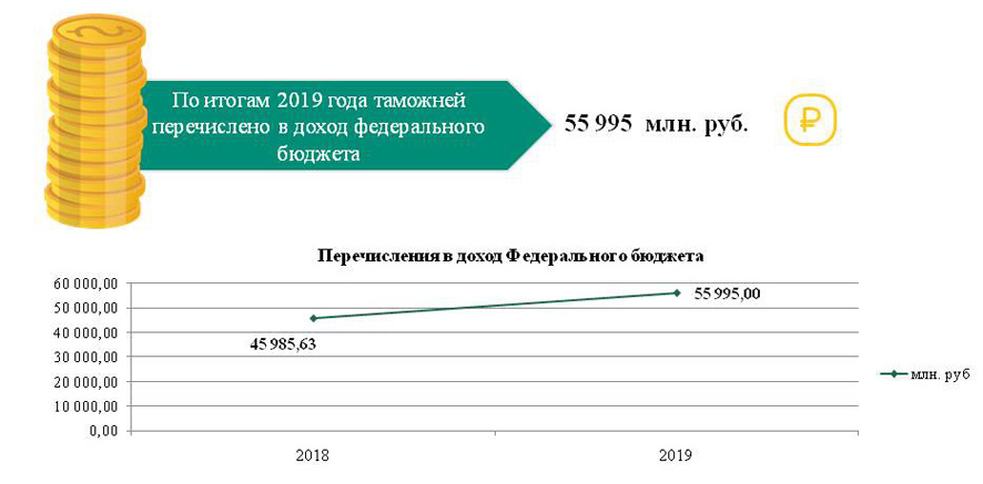 В 2019 году Хабаровская таможня перечислила в бюджет Российской Федерации таможенные платежи на сумму более 12,4 млрд рублей. Это на 1 млрд рублей больше, чем в 2018 году.
