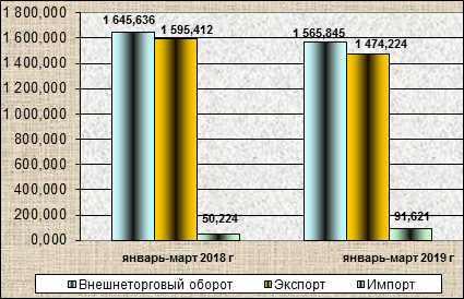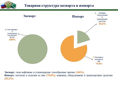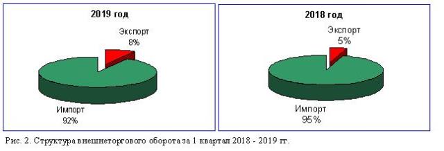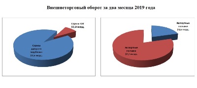 Внешнеторговый оборот в январе и феврале этого года составил 2,9 млрд долларов США. Импорт составил 20,7% ($597,5 млн.) от внешнеторгового оборота, соответственно на экспортные поставки пришлось 79,3% ($2,3 млрд.).