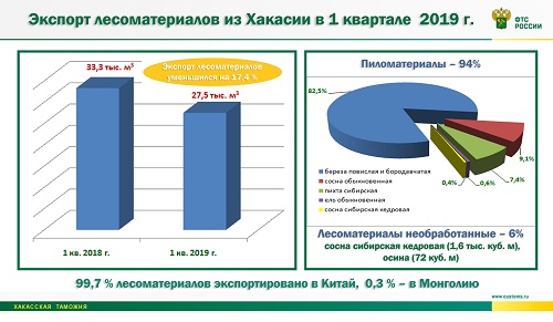 Всего в 1 квартале 2019 года через пункты пропуска Бурятской таможни (ЖДПП Наушки и МАПП Кяхта) было вывезено 700 тыс. кубометров экспортируемых лесоматериалов, общей стоимостью около 47 млн долларов США. По сравнению с тем же периодом 2018 года объём вывезенного леса увеличился на 33%, стоимостные показатели – на 35%.