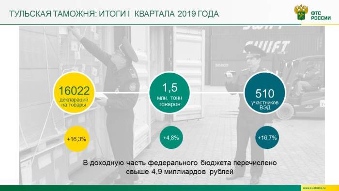 Всего в 1 квартале 2019 года подразделениями таможенного контроля после выпуска товаров проверено 418 юридических лиц, в деятельности которых выявлено более 2 тыс. нарушений. Возбуждено 1345 дел об АП и 53 уголовных дела. В федеральный бюджет перечислено 1,3 млрд руб. таможенных платежей, пеней, штрафов.