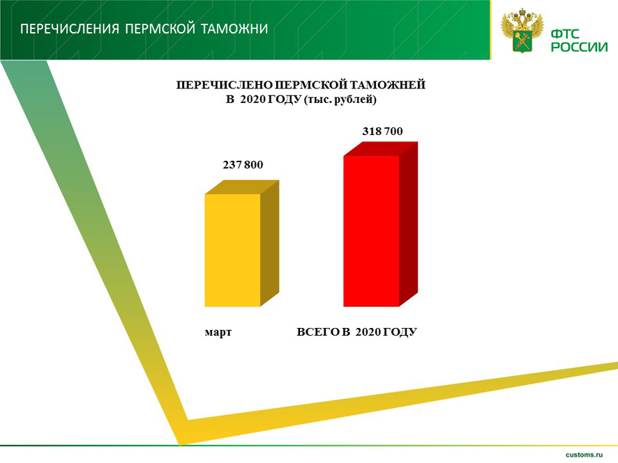 Перечисления Пермской таможней в федеральный бюджет в марте 2020 года составили 237 млн 800 тыс. рублей.