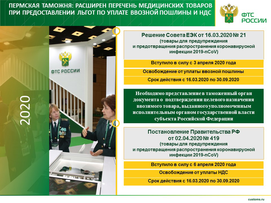 Владимирская таможня напоминает: решением Совета ЕЭК от 16 марта 2020 года №21 до 30 сентября 2020 года обнуляются пошлины на товары, ввозимые в целях предупреждения и предотвращения распространения коронавирусной инфекции на территории ЕАЭС. Ранее ввозные пошлины на товары этой группы составляли преимущественно 5–20%.