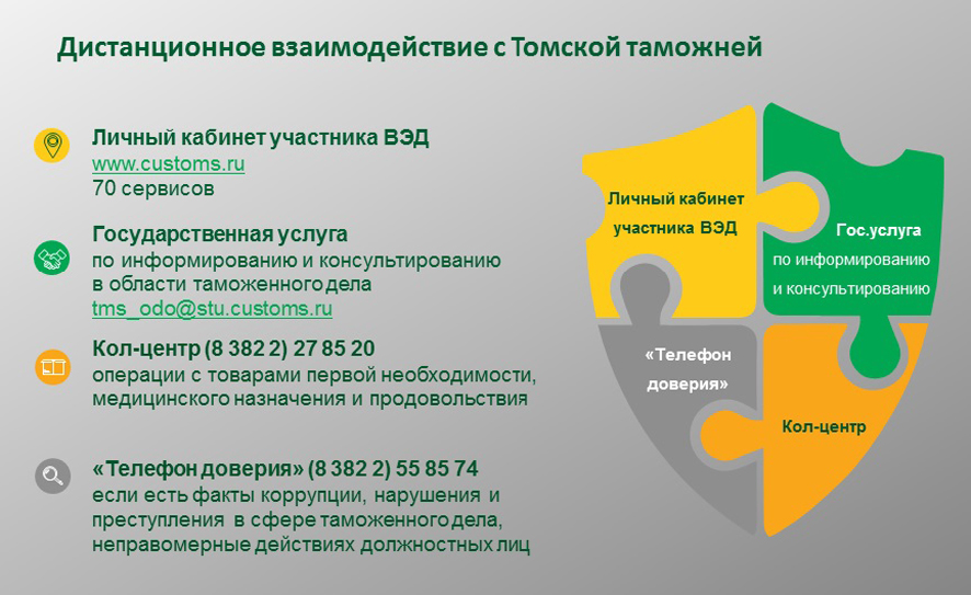Владимирская таможня рекомендует участникам внешнеэкономической деятельности и гражданам использовать электронные сервисы и направлять обращения в письменной форме для снижения рисков распространения коронавирусной инфекции. Так, для получения государственной услуги по информированию и консультированию по вопросам, входящим в компетенцию таможенных органов, рекомендуется направлять письменные запросы и письменные обращения по адресу: 600005, г.Владимир, ул.Асаткина, д.35 или по электронной почте: VLADIMIR@ctu.customs.ru