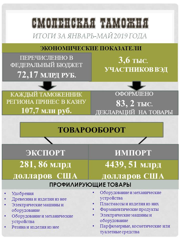 В отношении юридических, физических лиц и индивидуальных предпринимателей за 5 месяцев 2019 года было проведено 379 проверочных мероприятий (за аналогичный период 2018 года – 187). В перечень основных направлений таможенных проверок вошли: контроль достоверности заявления таможенной стоимости; проверки в отношении объектов интеллектуальной собственности при обороте товаров, ввезенных на таможенную территорию Евразийского экономического союза; контроль достоверности заявления кода товара в соответствии с Товарной номенклатурой внешнеэкономической деятельности Евразийского экономического союза. С начала года было взыскано 35,5 миллионов рублей, возбуждено 2 уголовных дела и 41 – об административных правонарушениях.