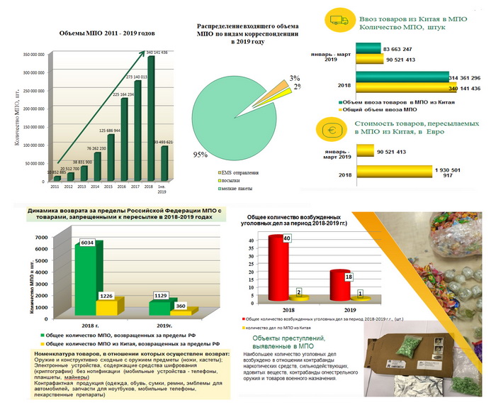 Стоит отметить, что 17,5 тонн данных товаров являются контрафактными. В результате, возвращено в страну отправления 349 тонн, задержано 22 тонны, уничтожено 5,5 тонн. Также, в 2019 году было зарегистрировано сообщение о преступлении, наказание за которое предусмотрено частью 2 статьи 228 Уголовного кодекса Российской Федерации, вследствие обнаружения психотропного средства «порошок белого цвета, содержащий в себе амфетамин массой 1,85 г».