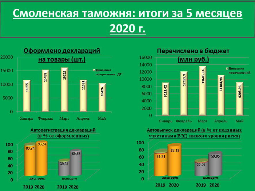 Всего за май 2020 года смоленские таможенники оформили 470 деклараций на данные товары. Их вес составил более 3,2 тыс. тонн, а стоимость около 49 млн долл. США.