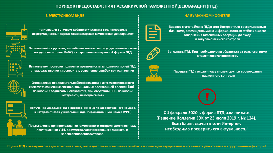 С 1 февраля 2020 года вступило в силу решение Коллегии Евразийской экономической комиссии от 23 июля 2019 года № 124 «О таможенном декларировании товаров для личного пользования». Этим решением утверждена новая форма пассажирской таможенной декларации (ПТД), а также порядок ее заполнения. Он определяет правила заполнения ПТД при таможенном декларировании товаров для личного пользования в виде электронного документа