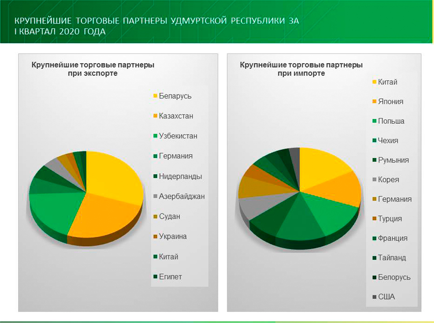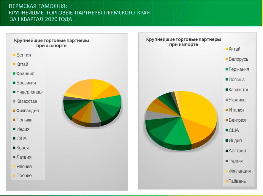 По сравнению с 1 кварталом 2019 года товарооборот СФО с Китаем уменьшился на 12,5%, с Нидерландами – на 40,9%, с Германией – на 36,2%, с Польшей – на 34,2%, с Республикой Корея – на 25,7%, с Японией – на 20,9%, с Тайванем – на 3,8%. При этом в торговле с Францией внешнеторговый оборот вырос в 2,7 раза, с Турцией – на 42,0%, с США – на 28,4%, с Казахстаном – на 3,2%.