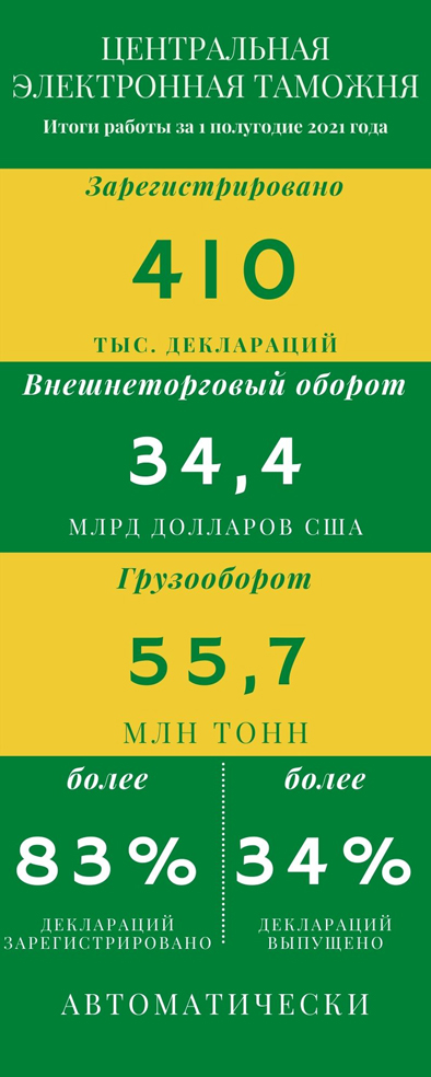 «С начала года Центральным таможенным постом было зарегистрировано 419 тысяч деклараций, 83,4% из которых были зарегистрированы автоматически, без участия таможенного инспектора. Среднее время регистрации таких деклараций по импорту составило 2 минуты 30 секунд, по экспорту 55 секунд» - отметил начальник Центральной электронной таможни Сергей Беляев.