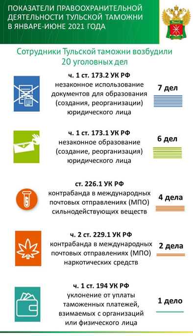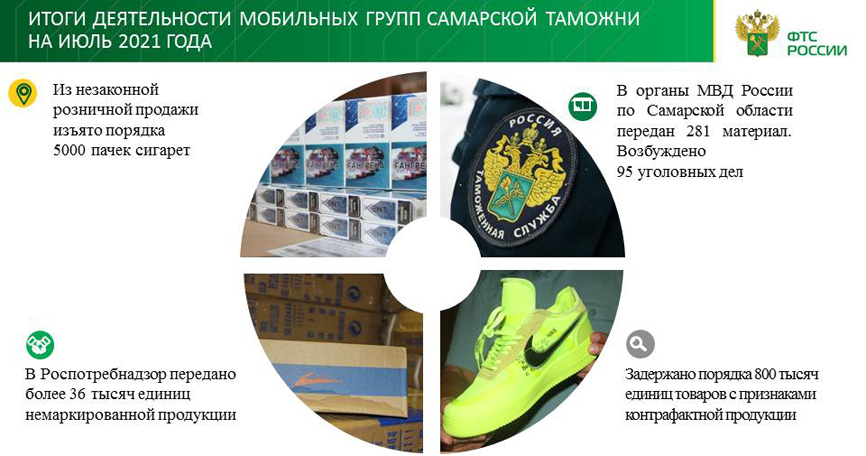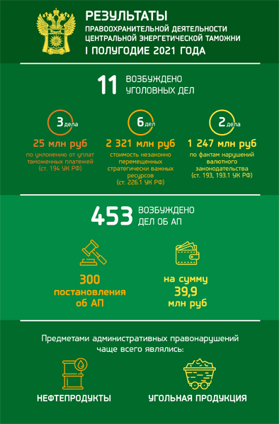 За 5 месяцев 2021 года в федеральный бюджет перечислено по всем видам таможенных платежей более 76,6 млрд рублей. В результате правоохранительной деятельности возбуждено 603 дела об административных правонарушениях и 12 уголовных дел. Установлен факт ввоза 45,6 кг «санкционного» товара, осуществлено 7 приостановлений выпуска товаров, выявлено около 920 тысяч единиц контрафактной продукции. Размер причиненного правообладателю ущерба составил более 71 миллиона рублей.