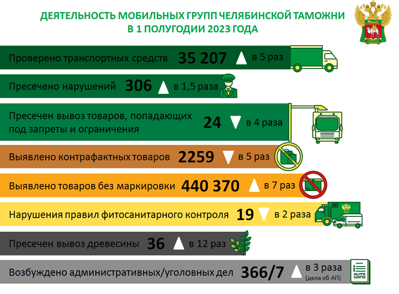 В 1 полугодии 2023 года мобильными группами Саратовской таможни на автодорогах региона деятельности и в автомобильном пункте пропуска Озинки было проконтролировано более 23 тысяч грузовых транспортных средств с товарами. В результате было выявлено 328 грузовиков перевозивших товары с различными нарушениями, что в два раза больше, чем в аналогичном периоде 2022 года (тогда было выявлено 156 транспортных средств).