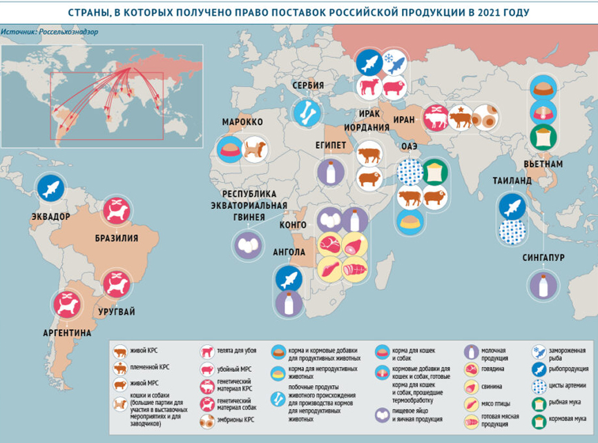 Пандемия COVID-19 внесла коррективы во многие сферы деятельности. Без ее влияния не осталось и перемещение сельскохозяйственной продукции между странами. В новых условиях экспортерам стало труднее получить возможность отправлять товары на рынки стран, куда ранее поставок не было. Однако, даже несмотря на возникающие трудности, только с начала 2021 года более 30 наименований продукции животного происхождения стало возможно экспортировать почти в 20 государств, в которые они до этого не ввозились.