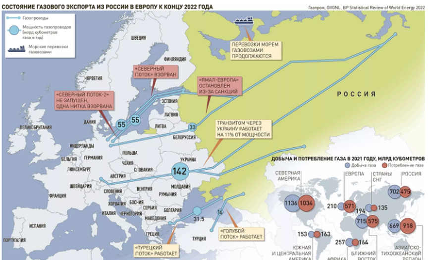 Подрыв "Северных потоков", остановка прокачки по газопроводу "Ямал - Европа" и снижение в 2,5 раза транзита через Украину сделали невозможным не только наращивание экспорта газа на Запад, но и даже сохранение объемов поставок на прежнем уровне. При этом для бюджета нашей страны снижение экспорта газа в Европу не так критично, как проблемы с экспортом нефти и нефтепродуктов, что может снизить объемы добычи и переработки сырья в России. Значительно серьезнее последствия для Евросоюза, экономический рост которого в последние годы во многом был обеспечен поставками нашего газа.