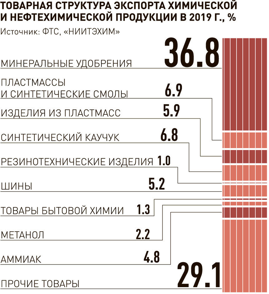 Российские химики реализуют за рубежом не менее трети произведенной продукции. Экспортные потоки химической и нефтехимической продукции направляются более чем в 100 стран мира. При этом доля продукции конечного назначения в отраслевом экспорте составила в 2019 году 51,4 процента.