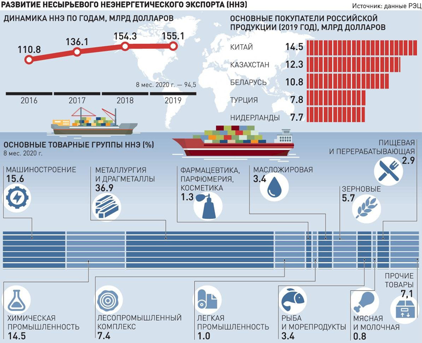 В России в последние годы активно развивается система поддержки экспорта, а в июле президент России Владимир Путин включил показатели ННЭ в число ключевых до 2030 года. Рост должен составить к 2030 году не менее 70% по сравнению с 2020 годом.