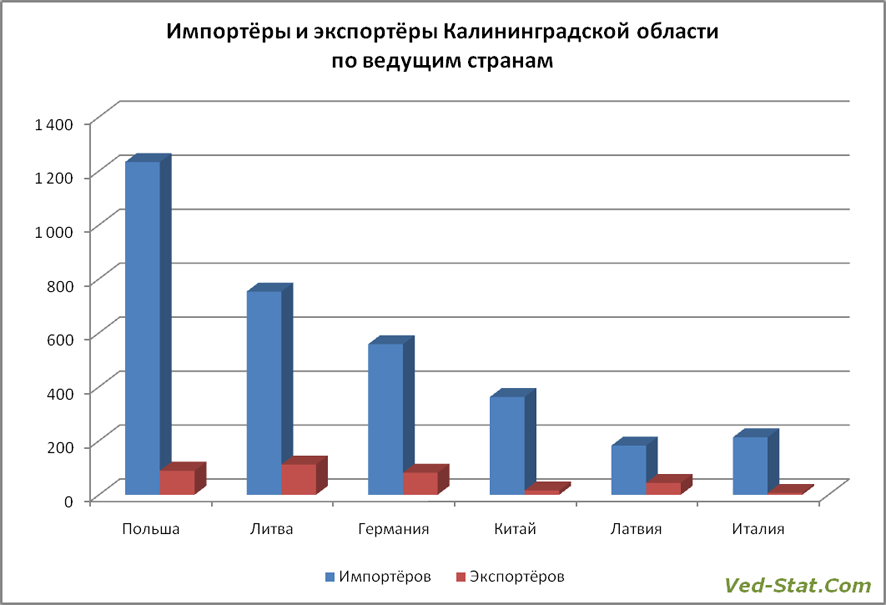 Выгодное геополитическое положение, которым обладает Калининградская область, открывает доступ к внешним европейским рынкам, а морские пути сообщения позволяет осуществлять торговлю со странами Азиатского и Тихоокеанского региона. Внешнеэкономическая деятельность региона ориентирована на ввоз товаров, доля импорта составляет около 80% товарооборота ВЭД. Основными странами-поставщиками импорта на протяжении многих лет остаются Польша, Литва и Германия. Основной партнёр России по внешним торговым сделкам, Китай, в Калининградской области не занял позиции лидера и обосновался на 4 месте.