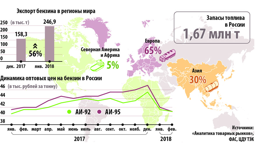Поставки увеличились из-за профицита топлива в России. Он сформировался во многом благодаря действиям Федеральной антимонопольной службы (ФАС). Там в середине ноября прошлого года посоветовали нефтяникам снизить экспорт бензина в последние месяцы 2017-го, пояснил «Известиям» гендиректор агентства «Аналитика товарных рынков» Михаил Турукалов.