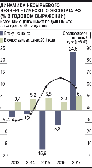 Изменение экспортного климата, в котором РЭЦ принимал самое непосредственное участие, привело к тому, что уже год наблюдается разворот в ситуации с несырьевым экспортом из России. По расчетам РЭЦ, несырьевой неэнергетический экспорт (ННЭ) в 2017 году составил $133,8 млрд, или 37,4% в общей структуре российского экспорта — этот показатель уже довольно существенно превосходит уровень первой половины 2010-х годов. Рост ННЭ по сравнению с 2016 годом составил 22,7% (+$24,7 млрд). Среди основных товаров несырьевого неэнергетического экспорта, по данным РЭЦ,— пшеница (4,3%), алюминий и его сплавы (3,9%), пиломатериалы (2,9%), рафинированная медь (2,7%), горячекатаный нелегированный листовой прокат (2,3%), смешанные удобрения (2,1%). Наибольший же рост в стоимостном выражении показал экспорт драгоценных металлов и камней (+50%), металлопродукции (+30%), промышленных товаров (+27%), продовольствия (+25%), стекла, керамики, изделий из камня (+23%). Экспорт продовольствия, лесобумажных товаров и разных промышленных товаров при этом достиг рекорда.