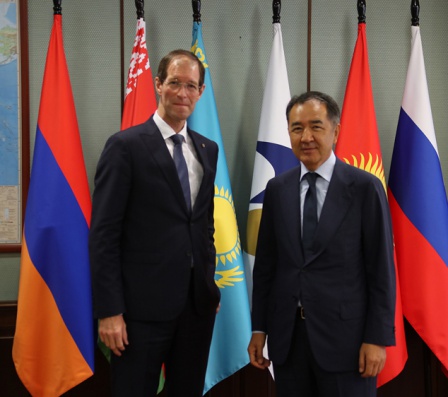 Вопросы функционирования Евразийского экономического союза и перспективы сотрудничества с европейским бизнес-сообществом обсудили на рабочей встрече министр по экономике и финансовой политике Евразийской экономической комиссии Бакытжан Сагинтаев и председатель правления Международной бизнес-инициативы «Лиссабон – Владивосток» Ульф Шнайдер 4 августа в штаб-квартире ЕЭК.